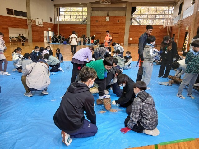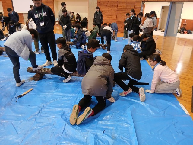 次に、一人ずつ、のこぎりで間伐材を切っていきました。切ることに夢中で、からだがポカポカしていました。