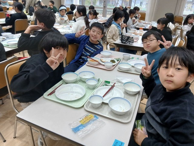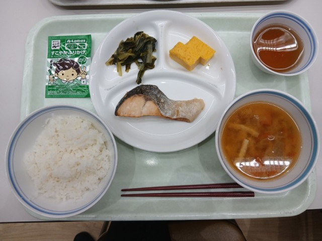 ごはん、ふりかけ、さけの塩焼き、卵焼き、小松菜の煮浸し、ほうとう風味噌汁
