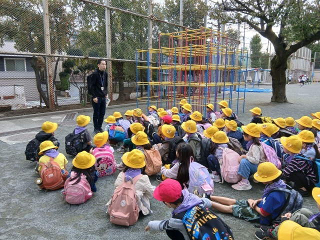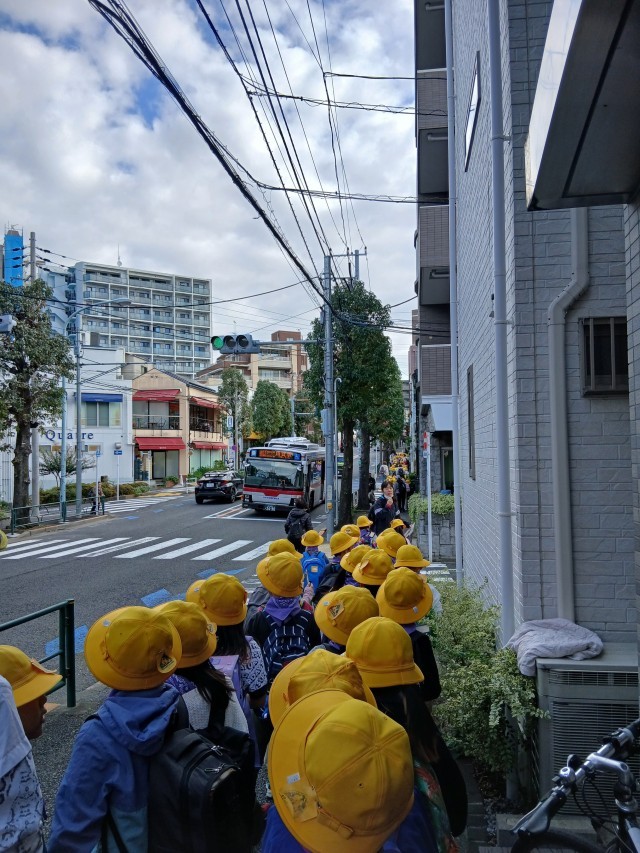 歩いて碑文谷公園にいってきました。爽やかな天候の中で、元気に学校を出発。道路の歩き方も上手な一年生です。