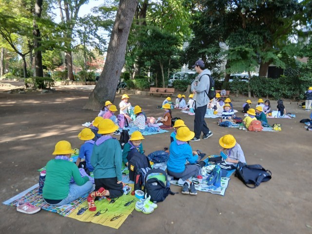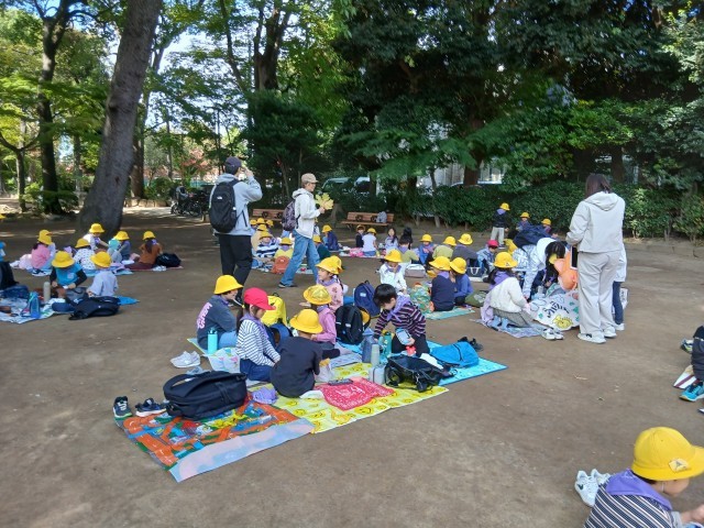 クラス遊び、ふれあい広場での活動が終わり、待ちに待ったお弁当の時間になりました。広場でお友達とレジャーシートを敷いてお弁当を食べました。