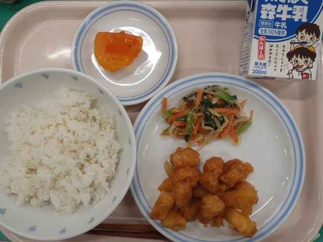 ・ごはん ・魚のチリソース ・野菜の中華ごまだれ和え ・果物(柿) ・牛乳