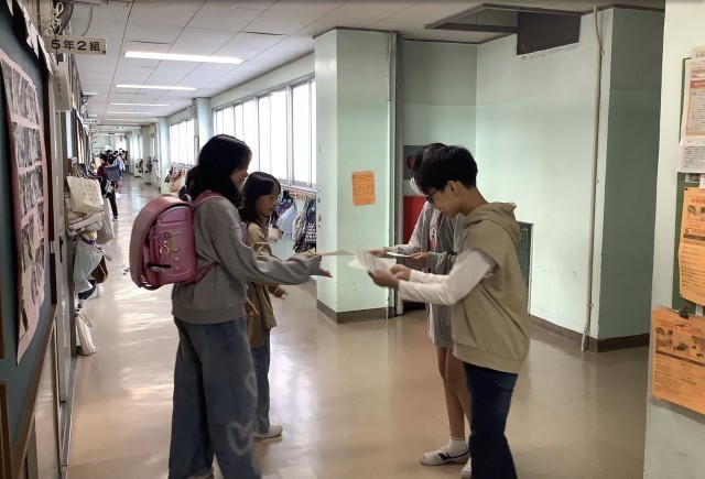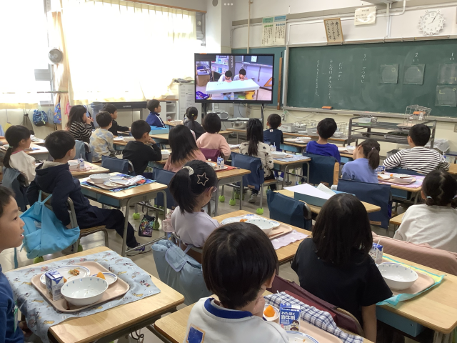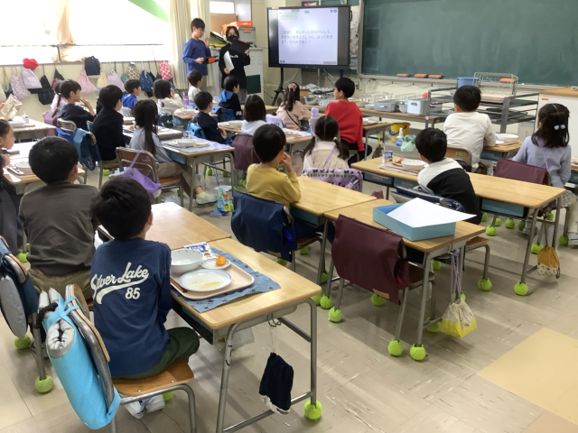前日、1年生が遠足で不在であったため、給食中に6年生が「服のチカラプロジェクト」について伝えに行きました。スライドや演劇など、伝える方法を6年生自ら考えました。