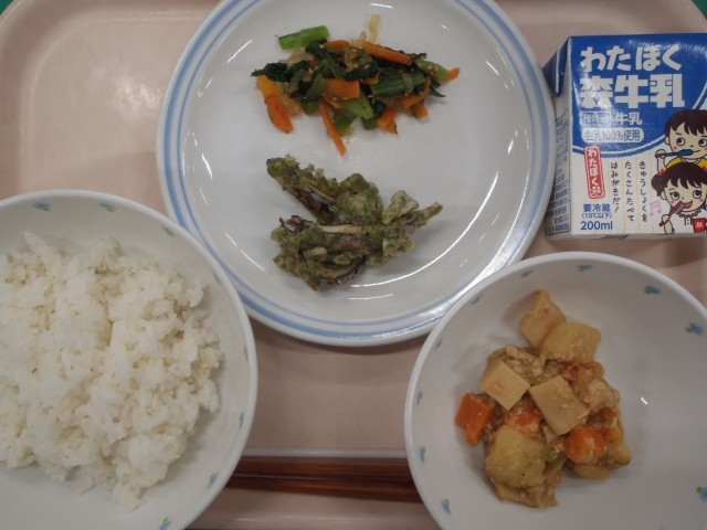 ・ごはん ・きびなごの磯辺揚げ ・野菜の梅おかか和え ・じゃがいもと大豆のごま煮 ・牛乳