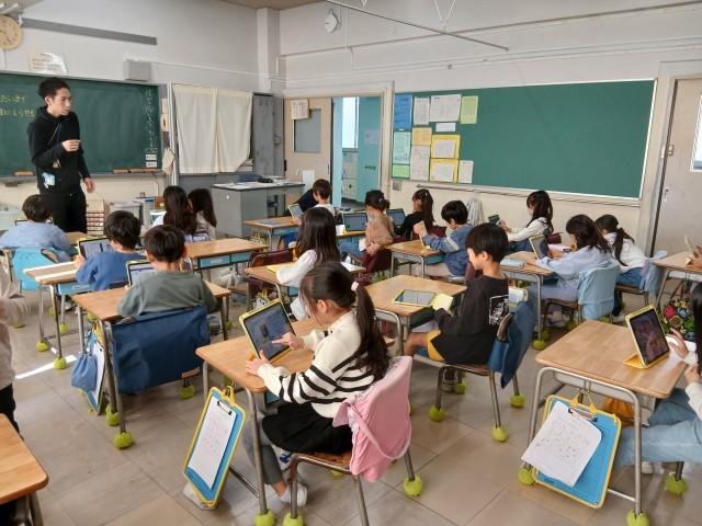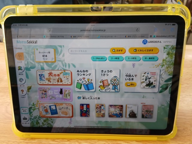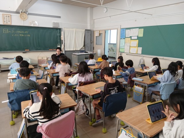 今週から学習用情報端末が新しく入れ替わりました。低学年は、今までよりも軽くなり、使いやすくなりました。写真は一年生の様子です。