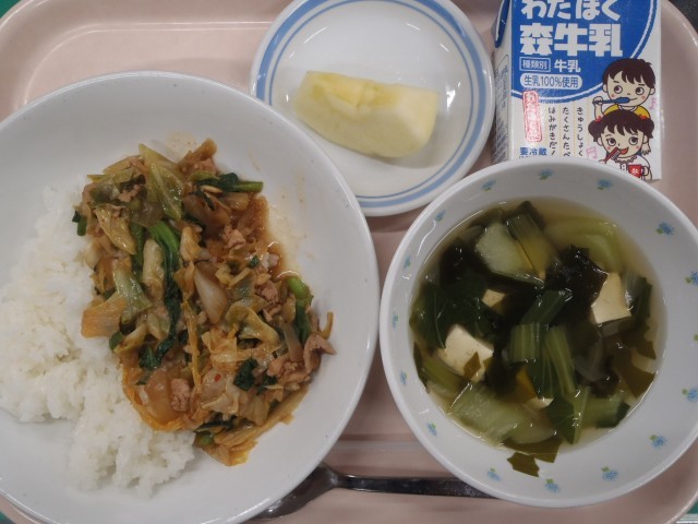 ・キムチ丼 ・チンゲン菜とわかめのスープ ・くだもの(りんご) ・牛乳