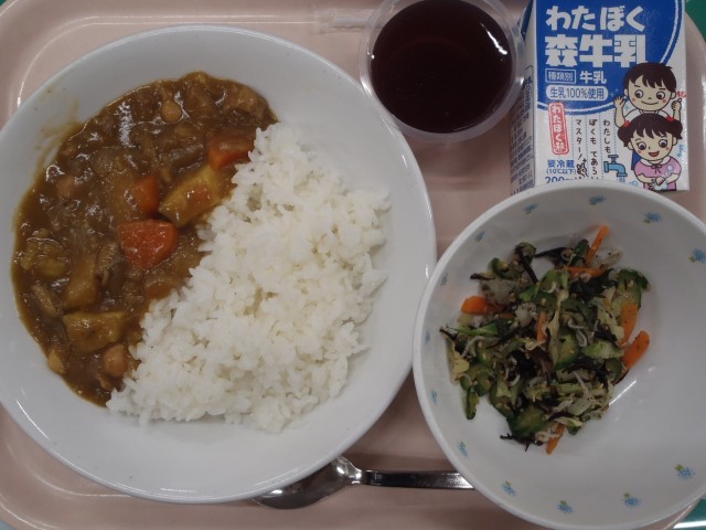 ・さつまいものカレーライス ・じゃことひじきのサラダ ・グレープゼリー ・牛乳