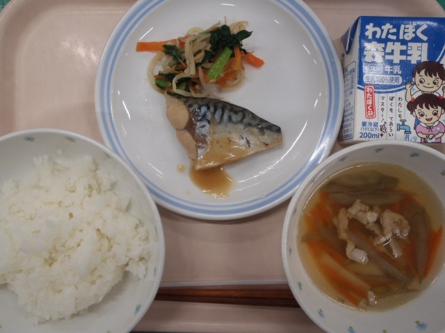・ごはん ・さばのみそ煮 ・お浸し ・沢煮椀 ・牛乳