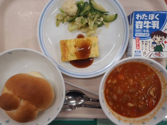 ・ミルクパン ・ハムとキャベツの卵焼き ・花野菜のサラダ ・鶏肉と麦のトマトスープ ・牛乳