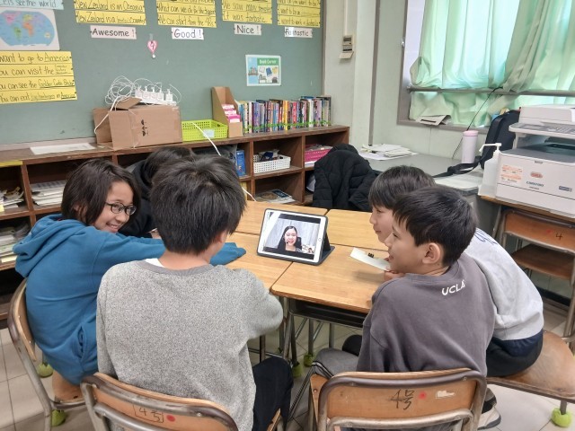 5年生のオンラインブレンディッド(オンラインで外国の人と英会話する)の授業がありました。クラスごとに一時間ずつの授業になります。今回は2回目ということもあり、子どもたちもなれてきて、自己紹介をして英語で質問に答えていました。