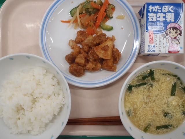 ・ごはん ・魚のチリソース ・大根と茎わかめのサラダ ・にら玉汁 ・牛乳