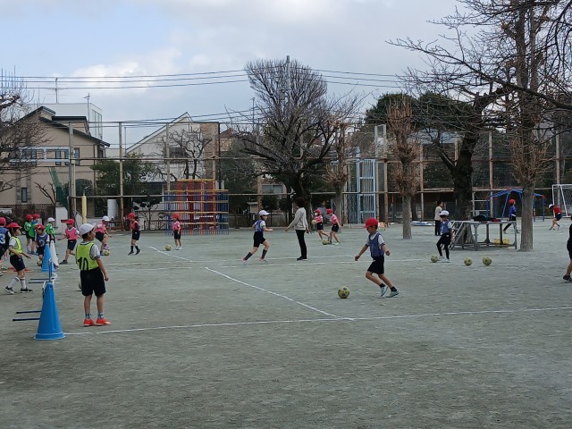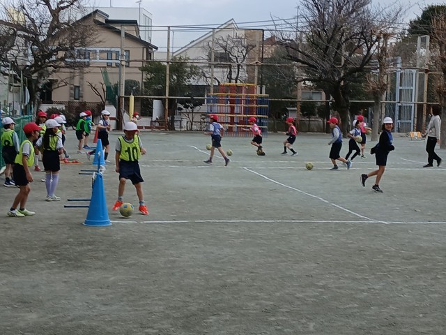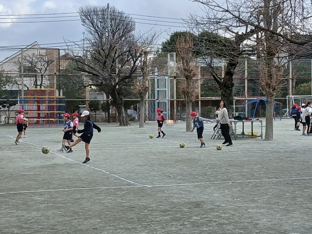 2年生は小校庭で体育をしています。この時期は子どもたちが大好きなボール蹴り運動をやっています。ペアになってボールをコントロールしながら蹴りあう練習をしていました。寒くなってきたので、体を動か時間をできるだけ多くとり、体育を行っています。