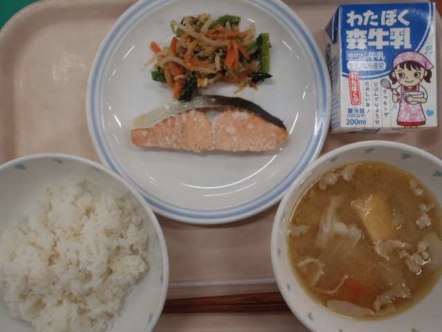・ごはん ・鮭の塩焼き ・ごま和え ・豚汁 ・牛乳