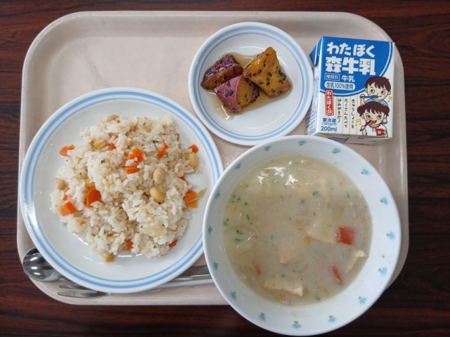 ・ツナと大豆のピラフ ・飛鳥チャウダー ・大学芋 ・牛乳