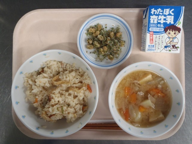 4月10日(金)の給食 公開日 2026/04/13 更新日 2026/04/13 給食 4月10日(金)の給食こぎつねごはん豚汁のり塩じゃこ大豆牛乳1年生の給食が始まりました。1年生の教室に給食が運ばれると「早く食べたい!」とわくわくしていました。説明を聞いて協力しながら配膳ができました。 いいね(0)