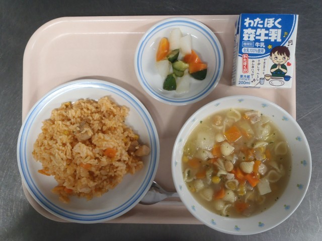 4月23日(木)の給食 公開日 2026/04/23 更新日 2026/04/23 給食 4月23日(木)の給食チキンライスひよこ豆と野菜のスープ野菜ピクルス牛乳野菜のピクルスは、茹でた野菜に塩で下味をつけて冷やしたのちに甘酢と一緒に和えました。「今日の給食が全部おいしかったです。特に野菜のピクルスです。」と声をかけてくれた1年生がいました。 いいね(0)