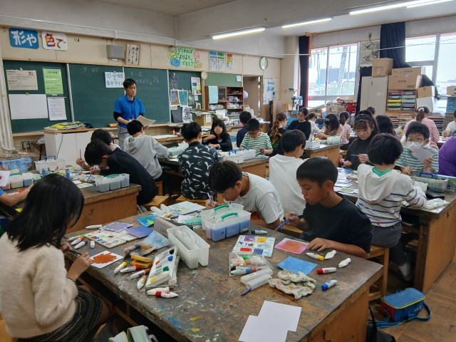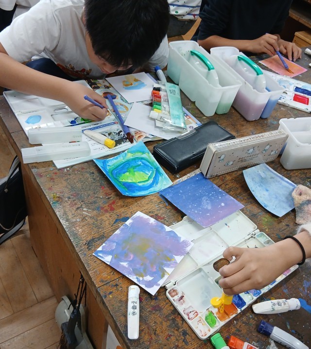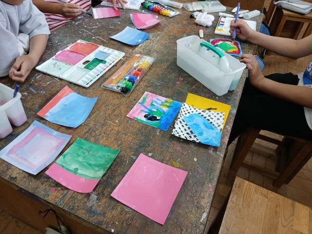 絵の具を使って、今の自分の心を表現します。絵の具の濃淡、塗りかた、模様を工夫し、個性が表れていました。
