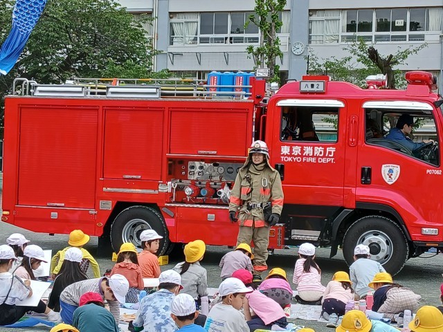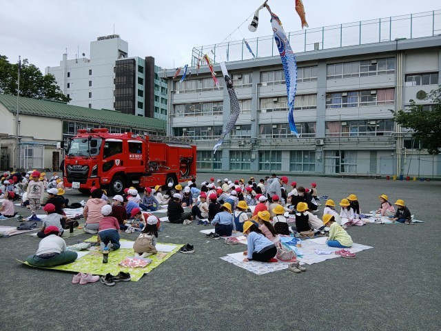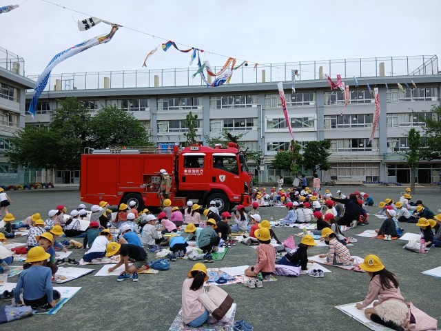 毎年、恒例となりました、消防写生会がありました。1.2年生が大きな画用紙に消防車や消防士さん、消防団の方々をかきました。暑くもなく、寒くもなく、爽やかな天候だったので、落ち着いて絵をかくことができたようです。