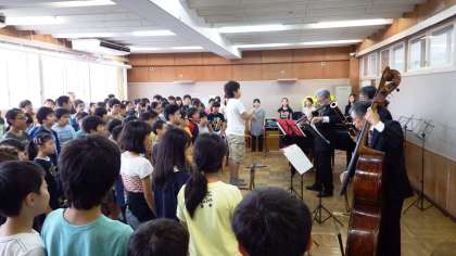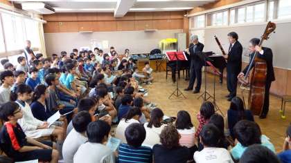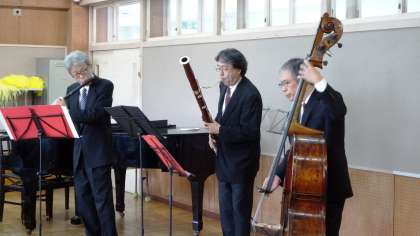 文化庁の文化芸術による子どもの育成事業として、アンサンブル・アディ・コンサートが多目的室で開催されました。3名の方々が6年生101名のためにコントラバス、ファゴット、フルートを演奏してくださいました。子どもたちは間近での演奏に心を打たれ貴重な経験ができました。