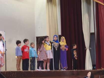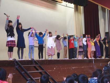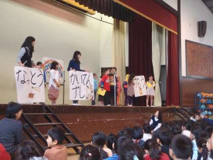日本語国際学級の子どもたちが、東根小学校の全校児童や先生方、保護者のみなさんの前で、住んでいた国のことばや日本語で話したり、歌ったりしました。日本に来てびっくりしたことについてクイズも出し、盛り上がりました。