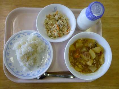 ごはん、カレーの肉じゃが、チーズうの花、牛乳