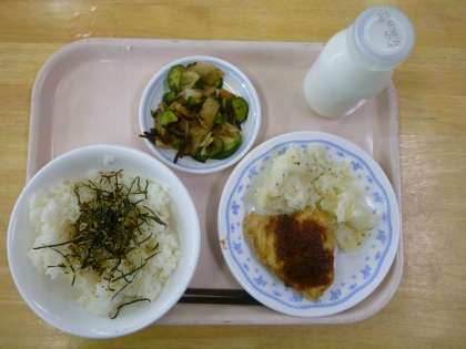 ふりかけごはん、魚のかわりソースかけ、粉ふき芋、野菜の昆布あえ、牛乳