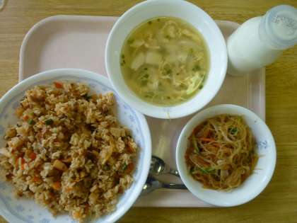キムチチャーハン、中華スープ、バンサンスー、牛乳