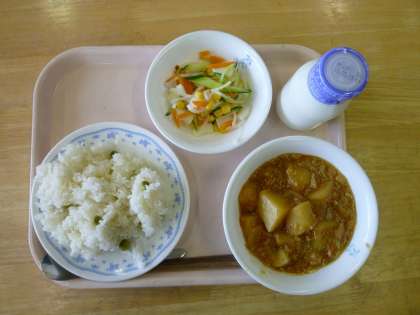 グリンピースごはん 新じゃがのそぼろ煮 イカと野菜の酢の物 牛乳