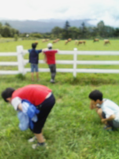10:30 広い原っぱで30分ほど思い思いに遊びました。走り回ったり、馬やひまわり畑を見たり、バッタや四つ葉のクローバーを探したりして楽しみました。