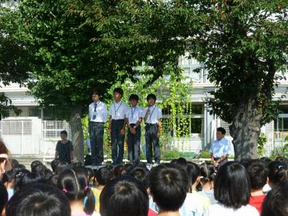 8/29 全校朝会 公開日 2011/08/29 更新日 2011/08/29 今日のできごと 今日の全校朝会で桜修館中等教育学校三年生の4人があいさつをしました。 今週の水曜日まで職場体験として小学校の先生の仕事について学びます。 いいね(0)