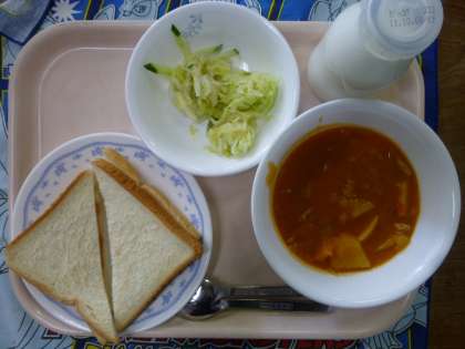 ダブルサンド、トマトシチュー、フレンチサラダ、牛乳 トマトシチューは子どもたちに大人気でした。
