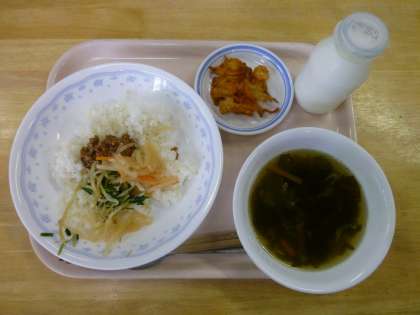ビビンバ、わかめスープ、川えびのから揚げ、牛乳