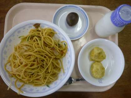 サラダスパゲッティー、さつまるくん、くだもの、牛乳