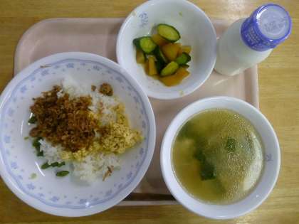 三色丼、とうがんのスープ、中華風きゅうり、牛乳