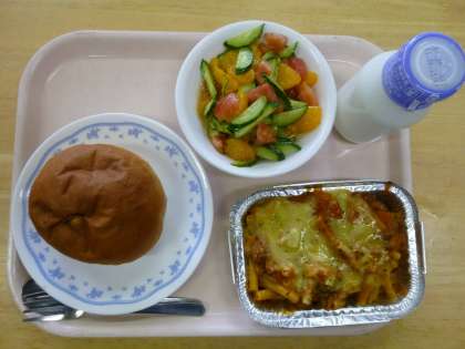 ブドウパン マカロニグラタン トマトとキュウリのサラダ 牛乳 洋風です。