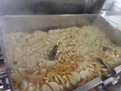 給食室でていねいに調理して、特製のみそだれをかけておいしくいた