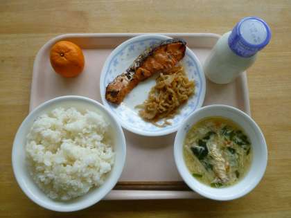 今日の鮭は「銀鮭」という種類です。塩がきいてしょっぱくなりました。また、切干大根は有名な宮崎県のものです。大根の皮を細く切って日光に干します。日光に当たると、カルシウムが4倍も増えます。また、エネルギーも生の大根より1.5倍も多くなります。