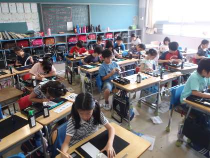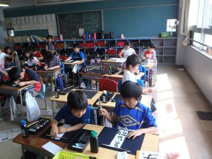 初めて習字の学習をしました。小筆で自分の名前を書きました。集中して取り組んでいます。