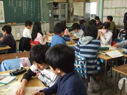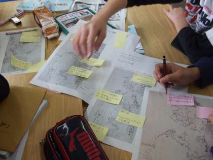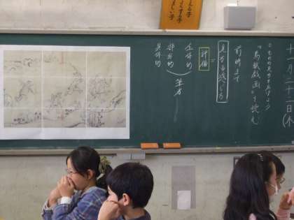教科書に載っているのとは別の「鳥獣戯画」を資料にして、表されている絵の意味について一人一人が考え付箋に書きました。さらに自分の考えをグループやクラス全体と交流することで、自分のものの見方を広げました。