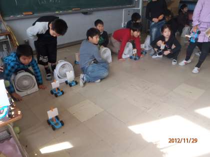 11月29日 3年 理科 公開日 2012/11/29 更新日 2012/11/29 今日のできごと 「風のはたらき」の学習をしています。風の強さや風受けの大きさで、クルマが進む速さは変わるのでしょうか。役割分担をして実験をしています。 いいね(0)