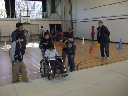 ボランティアセンター、東が丘福祉工房の方々をゲストティーチャーにお招きして、福祉体験学習を行いました。東が丘福祉工房の紹介ビデオを見たり、体育館で車いす体験や操作の仕方を学んだりしました。