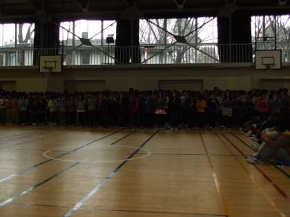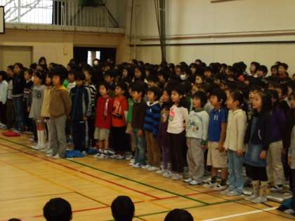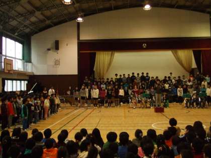 今朝は音楽集会が開かれました。1・6年合同で「ひょっこりひょうたん島」の合唱、2・5年合同で「大空がむかえる朝」の合唱、3・4年合同で「錨をあげて」の合奏をしました。