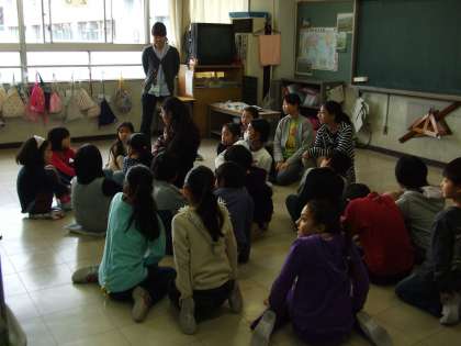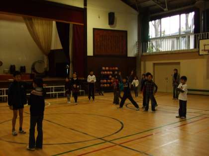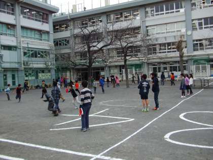全日公開日2日目の朝はたてわりタイムでした。校庭、体育館、屋上、教室に班ごとに分かれて遊びました。