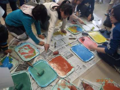 「はんで広げたゆめ」という題材です。今日のめあては「イメージに合わせて色をえらび、インクをする」です。先生が色々な色のインクを用意してくれました。