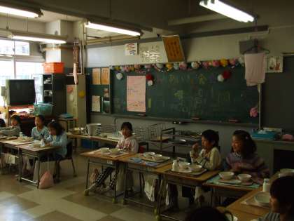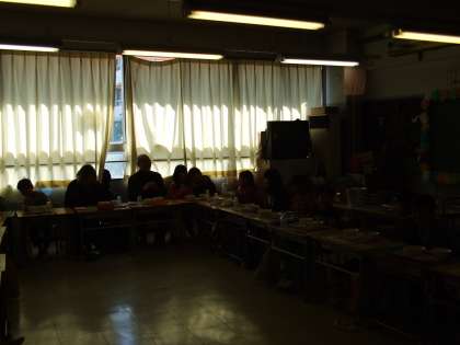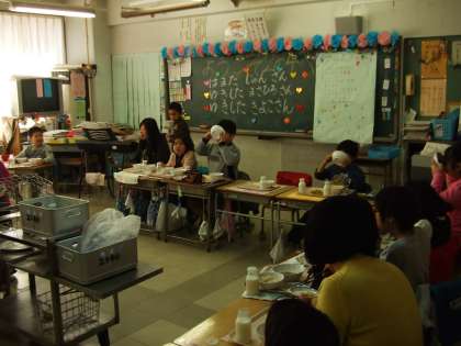 2年生は、お年寄りの方を招いてふれあい給食を開きました。お越しいただいた方を囲んで楽しく給食をいただきました。