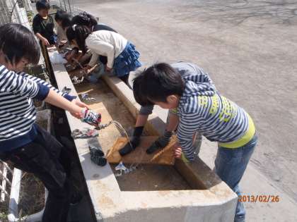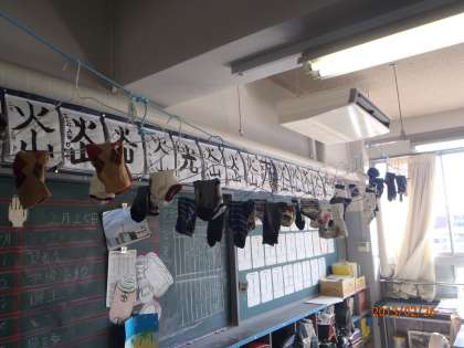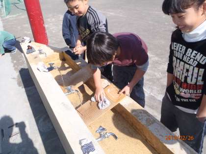 洗濯板で自分のくつ下を洗っています。先人の知恵がたくさん詰まった昔の道具です。体験を通していろいろな工夫を見付けることができました。