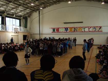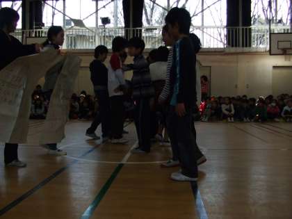 各学年からお世話になった6年生に、お礼の気持ちをこめて演技をしました。給食は6年生が各クラスに分かれて、お別れ給食会を開きました。昼休みには6年生と一緒に仲よく遊ぶ下級生の姿が見られました。