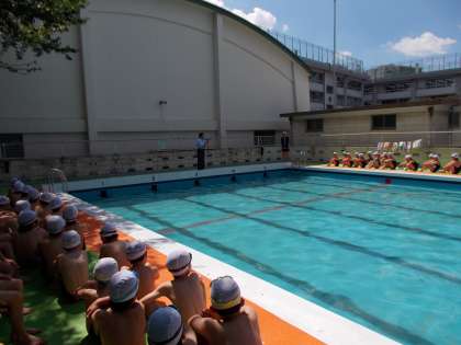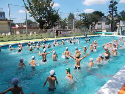 本日プール開きを行いました。東根小で今年初めて入る4年生です。