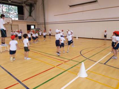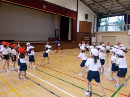 3クラス合同で赤白対抗でやりました。男の子も女の子も、一生懸命ボールを投げたり逃げ回ったりして、気持ちのよい汗をかきました。