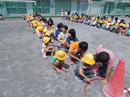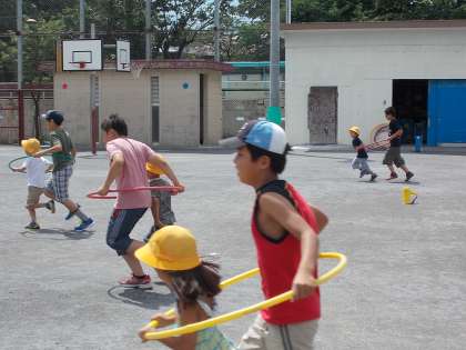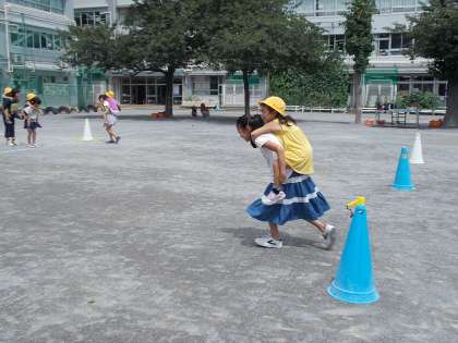1年生と6年生の異学年交流で、「フラフープリレー」「おんぶリレー」「だるまさんが転んだ」を行いました。