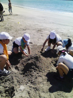 一つ目はどのグループが1番高い砂山を作ることができるか、競い合いました。